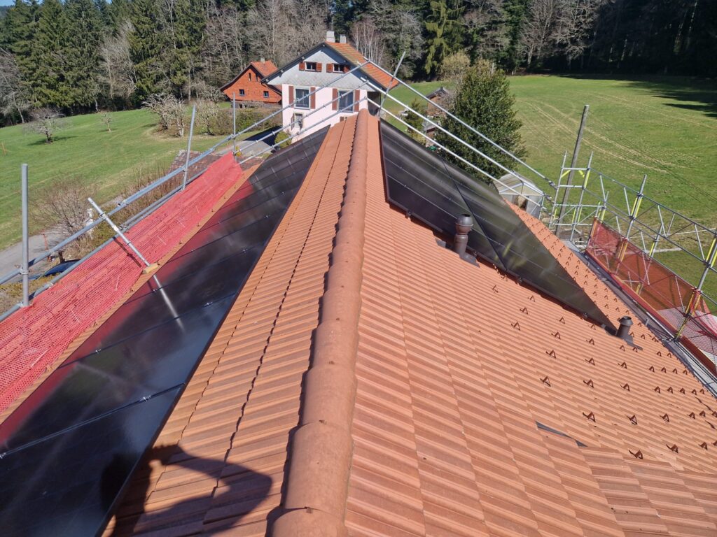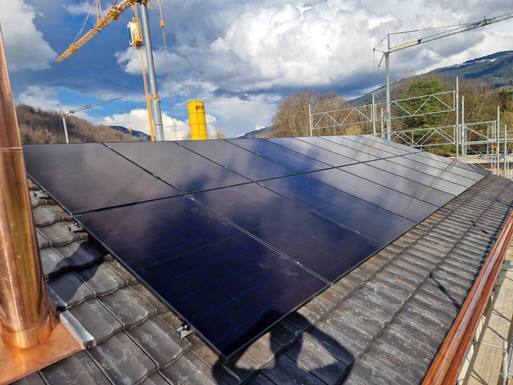 Installation de 13.6KWp à Charmey, production annuelle de 16’000KWh, utilisation d’optimiseurs de puissance, découpe et montage de modules factices autour de la cheminée.